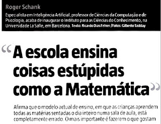 Há muito que digo que a escola que temos, a escola das jaulas, programada por uma cambada de mentecaptos sentados nas secretárias dos ministérios da educação (em geral, gente frustrada da ensinança que nunca conseguiu ou tentou dar uma aula a uma turma de 30 crianças ou adolescentes), é imensamente burra e ineficaz. Os resultados estão à vista e não vale a pena perder muito tempo a contestá-los. Os miúdos vomitam a escola e as sociedades pagam exorbitâncias para manter sistemas de ensino que quase só produzem ignorantes. O ponto está na... solução. Há quem acredite que com mais escola à moda antiga, mais programação e mais chicote... tudo se resolverá. Eu, que sou professor e sou pai, posso garantir que não. É preciso dar a volta à escola, virá-la do avesso, acrescentar-lhe sentido de aprendizagem e utilidade social. E o que diz, nesta entrevista, Roger Schank, não sendo original, nem sufragável por inteiro (pelo menos, na minha opinião), merece muito mais do que um sorriso de escárnio. Infelizmente, já sei o que dirão ou pensarão os... iluminados do costume. Mais chicote, mais chicote... e tudo, miraculosamente, se resolverá. Por que não tentais?...